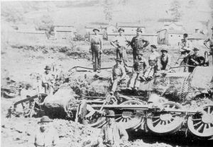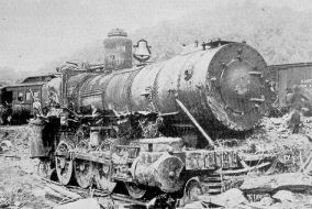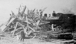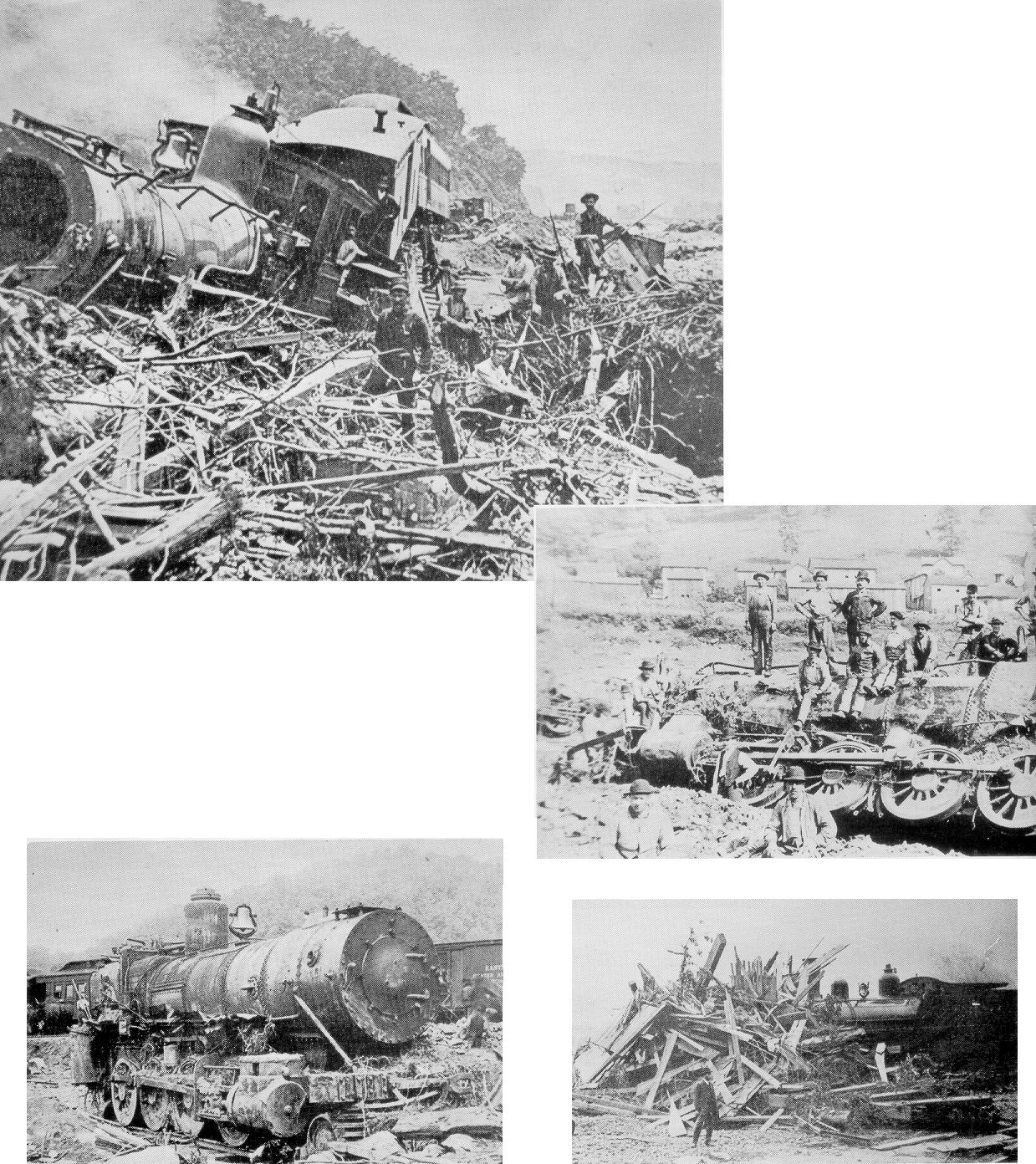 A house was piled against one train. A crew of workmen spent one day removing the wreckage. Other engines were destroyed by fire.