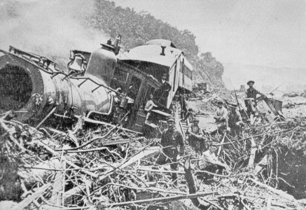 One car of the mail train and the first section of the Day Express was forced off the track and fell on their sides.