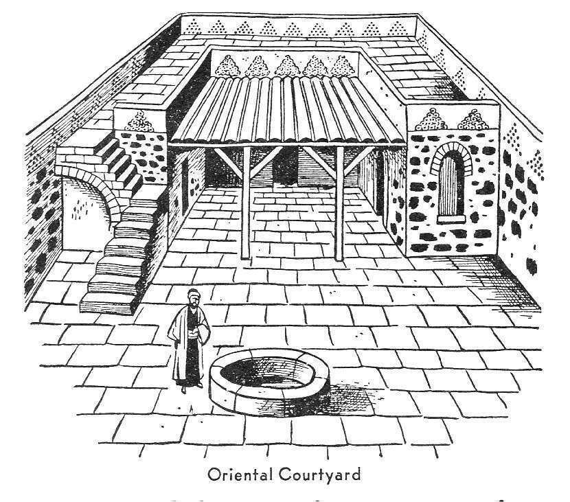 Often planted with trees, shrubs, or flowers. These Oriental courtyards are often made beautiful by the presence of trees, shrubs, or various flowers.7 The Psalmist refers to such a practice with the familiar words: "I am like a green olive tree in the house of God" ( Psa 52:8). And again he said: "Those that be planted in the house of the Lord shall flourish in the courts of our God" (Psa 92:13). He is illustrating divine truth by referring to trees so often planted in courtyards of houses. Actually trees were never planted in the Temple courts.8Cisterns often built in courts. The interesting story of two men in the days of David who hid from Absalom is told in 2Sa 17:18-19. "But they went both of them away quickly, and came to a man's house in Bahurim, which had a well in his court; whither they went down. And the woman took and spread a covering over the well's mouth, and spread ground corn thereon: and the thing was not known." The "well" mentioned here was actually a "cistern" which is often dug in Oriental courtyards in order to catch the rain water. When these cisterns are dry, they make good places for fugitives to hide. Because the mouth of these cisterns is at the level of the ground, it makes it easy to cover it over with some article, and then spread grain over that, and thus the place of hiding can be kept secret.9Fires often kindled in courts in cold weather. This practice is illustrated in Simon Peter's experience of denying Jesus. A fire was built in the courtyard of the high priest's house where JESUS was being tried. Joh 18:18 says: "And the servants and officers stood there, who had made a fire of coals; for it was cold: and they warmed themselves: and Peter stood with them, and warmed himself."Courtyard as a bathing-place. When the Scripture says that David from his palace roof saw the beautiful Bathsheba bathing ( 2Sa 11:2), it needs to be understood, that she was in the courtyard on the inside of her house, not visible to ordinary observation, yet the king from his palace roof saw her and was tempted to sin.10Meals often eaten in the courtyard. Today, as in the days of JESUS, meals are often eaten in the interior court of the Oriental house. No doubt JESUS was entertained at meals which were served in the open court of His host's house.11 THE DOOR AND THE PORCHLocation and appearance of the door. The door or gate was located in the middle of the front side of the house. This entrance was usually so arranged that nobody could see into it from the street. Sometimes a wall was built in front of it to serve this purpose.12 Oriental gates, or large doors often have small doors like a panel within them. The small door is in use for ordinary occasions, and the large gate or door is opened only on extraordinary occasions.13 Act 12:13 speaks of Peter knocking "at the door of the gate," which doubtless means the smaller door within the larger gate. The use of keys. The Oriental key of modern times is like the key of Isaiah's days, and most certainly not like the small occidental variety. Isa 22:22 says: "The key of the house of David will I lay upon his shoulder." Dr. Thomson tells of seeing different keys in Palestine that would be large enough to lay on the shoulder of a man. He saw one key about a foot and a half in length. The keys were usually made of wood. The lock is placed on the inside of the gate or door, and to make it possible for the owner of the house to unlock it, a hole is cut in the door, and he thrusts his arm through this hole, and then inserts the key. In Son 5:4, the bride says: "My beloved put in his hand by the hole of the door." She saw him thrust his hand through the hole, that he might unlock the door and then go in.14The porch and duties of the porter. The passageway inside the door and leading to the courtyard itself is called the porch. It is most often furnished with some kind of seats for the porter or for the servants.15 It was in this porch that one of Peter's denials, took place. "And when he was gone out into the porch, another maid saw him, and said unto them that were there, This fellow was also with Jesus of Nazareth" ( Mat 26:71; Mar 14:68).It is the duty of the porter (or servant or member of the family serving in that capacity) to parley with any visitor who knocks on the door desiring admission.16 The purpose of this is to give opportunity to recognize the voice of the visitor, and identify him as a friend. So it is not expected that the door will be opened as soon as the knock is heard. The one inside will call out, "Who?" And the outsider, instead of giving his name, will rather answer, "I." Act 12:13-14 says: "And as Peter knocked at the door of the gate, a damsel came to hearken, named Rhoda. And when she knew Peter's voice, she opened not the gate for gladness." When Rhoda had listened to Peter's voice then she recognized who it was outside the gate.The familiar words of Rev 3:20 present the same idea: "Behold, I stand at the door and knock: if any man hear my voice, and open the door, I will come into him," (for additional light on Rev 3:20, study the relation between host and guest as given in Chapter Seven of this book). We must recognize the voice of the Saviour who is knocking. When JESUS came walking on the water to the fearful disciples in the storm, He did not say: "It is Jesus, be not afraid," but rather, "It is I; be not afraid" (Mat 14:27; Mar 6:50; Joh 6:20). They heard His voice and recognized that it was the voice of Jesus. The Oriental is trained to listen to a voice and be able to recognize a friend.17THE UPPER ROOMThe upper room or chamber is a well-known part of many Oriental houses today, and is frequently referred to in the Bible (cf. 2Ki 1:2; 2Ki 23:12; Act 9:37; Act 20:8, etc.). Those who cannot afford such a room are content with booths or arbors on the roof of their houses. But when it is possible to do so they construct a room. It provides a place of coolness in the hot weather, a place of retreat, and a 