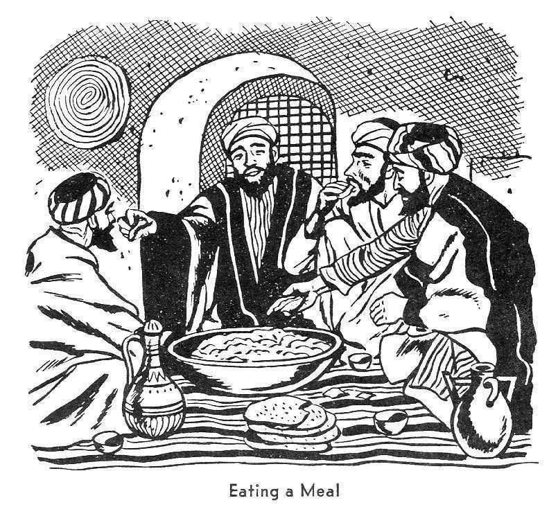 Customs at MealtimeEASTERN HABITS, connected with the eating of a meal, are such a decided contrast to Western habits, that much care should be given to the study of them, if the many references in the Bible to eating, are to be interpreted accurately. WASHING OF HANDS BEFORE EATING Orientals are careful to wash their hands before a meal, but they would think that the Occidental way of washing in the water already made dirty by the hands, to be very untidy and disgraceful. The servant or whoever takes his place, pours water on the hands to be washed as they are held over a basin. Often the basin has a concave cover with holes, so as to allow the dirty water to run through and thus be out of sight. The method of eating without knives, forks, or spoons, makes this washing a necessity.1 That this method of washing was in vogue in the days of the prophets is seen by the way Elisha was characterized by the king's servants: "Here is Elisha the son of Shaphat, which poured water on the hands of Elijah" ( 2Ki 3:11). Elisha had served as Elijah's servant, and pouring water, so that his master could wash his hands, was an important part of his duties.When the Pharisees complained against the disciples of JESUS, because they ate bread without washing their hands ( Mat 15:1-2; Mar 7:1-5), it was concerning a lengthy ceremonial washing of hands that they spoke. The Jewish hierarchy of that day had given forth a positive injunction as to exactly how this ablution should be done. It was not a law of Moses but a tradition of the elders. JESUS refused to sanction it as a rule that was binding. It was not the custom of washing hands before eating that JESUS objected to, but the authority the rabbis claimed to have in telling the people the exact and detailed manner in which it must be done.2POSITION WHILE EATINGAccording to general Arabic custom, the seemly posture while eating is "to sit erect on the floor at the low table, with the legs either folded under the body, or thrown back as in, the act of kneeling."3 Thus in the desert tent of the Bedouin, or in the simple house of the Fellahin, this would be the position of those eating a meal. And we can be sure that this was the posture of the common people of Bible days in most cases. The exception to this rule is the custom of the wealthy, or the habit of the people on special occasions such as suppers or feasts; and this will be dealt with in a later section. It is easy to imagine Elisha and the sons of the prophets eating in the usual Oriental position, when it says concerning them: "And the sons of the prophets were sitting before him: and he said unto his servant, Set on the great pot" ( 2Ki 4:38).USE OF TABLE, CHAIRS, AND DISHESTable. In many cases the Arab custom would seem to indicate to the Westerner that they use no table at all when serving a meal. Actually, a mat spread upon the ground serves the purpose of a table. This is especially true of the tent Arab.4