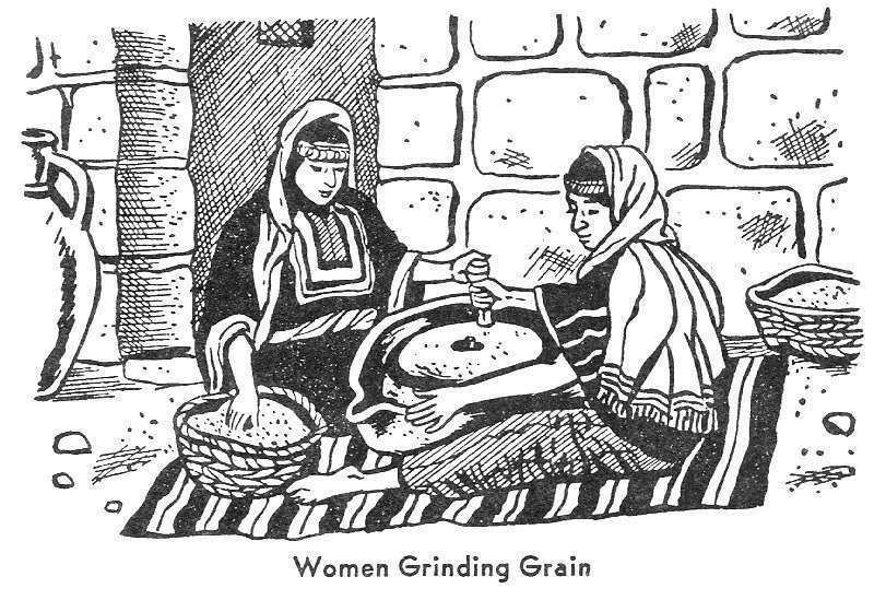The Bible references to the grinding mills are true to Oriental customs. The task is for servants if the family has them, and if not the women do the job, but the men would consider it beneath them to engage in such a menial task. Part of the judgment upon Israel at the destruction of Jerusalem was that the enemy "took the young men to grind" (Lam 5:13). And the Philistines punished Samson in this way, for it says of him, "and he did grind in the prison house" (Jdg 16:21). Although there are simple handmills made for the use of one person, more often two women operate one together. The mill is composed of two stones eighteen to twenty-four inches in diameter. The two women sit at these stones facing each other. The upper stone turns upon the lower one by means of an upright handle which the women alternately pull and push.3 Here is how the process works: