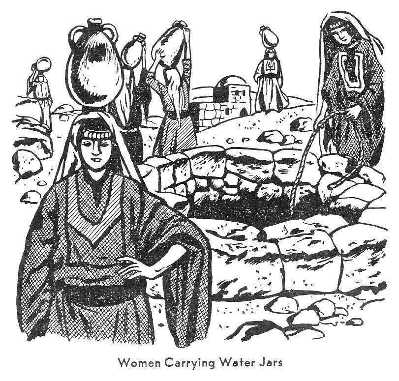 The large use of figures of speech in its teaching and conversation make the Book a typical Oriental book.20 The Oriental frequently makes statements that to the Westerner sound like uncalled-for exaggeration. One man will say to another, "What I say to you is truth, and if it is not, I will cut off my right arm." Or he will. say, "I promise you this, and if I fail in fulfilling my promise, I will pluck out my right eye." In those lands nobody would ever dream that such a resolution would be carried out. The statement simply means that the speaker is in earnest.21 An Oriental can fully appreciate what JESUS meant when he said, "If thy right eye offend thee, pluck it out, and cast it from thee... If thy right hand offend thee, cut it off, and cast it from thee" (Mat 5:29-30). Many expressions of JESUS need to be understood in the light of daily conversation of His day. Here are examples of a few. "It is easier for a camel to go through the eye of a needle, than for a rich man to enter into the kingdom of GOD" (Mat 19:24). "Ye blind guides, which strain at a gnat, and swallow a camel" (Mat 23:24). "And why beholdest thou the mote that is in thy brother's eye, but considerest not the beam that is in thine own eye?" (Mat 7:3). When reading such passages of Scripture, men from the Occident must remember the fondness of the Oriental for the hyperbole. Dealing with delicate subjects in mixed company. Visitors to Palestine from other parts of the world are often embarrassed by the way the daily conversation of the natives may include matters never spoken of in polite circles in the West. The Oriental considers it to be perfectly proper to talk about anything that is natural in the presence of men, women, and children. And this is done in refined circles. A respectable woman from the Holy Land cannot understand why some critics of the Bible have condemned the Scriptural mention of certain matters deemed wrong for Westerners to talk about. The story told in Genesis of the details concerning the birth of twin boys, Esau and Jacob (Gen 25:23-26), would be told in a public gathering in the East, with even more details, without a blush coming to any face. Several hundred years ago this same thing was true in England.22 GOING OF THE WOMEN FOR WATERIt is the task of the women to go for the household water to the well or spring. And they do it today in many places in the East just like it was done when the Genesis account speaks of it being "the time of the evening, even the time that women go out to draw water" (Gen 24:11). The women are trained to do this from girlhood, for Saul and his servant "found young maidens going out to draw water" (1Sa 9:11). The chief time for doing this is in the late afternoon or evening, although it is often done early in the morning. Earthenware pitchers (Lam 4:2) are used for the purpose, and they have one and sometimes two handles.23