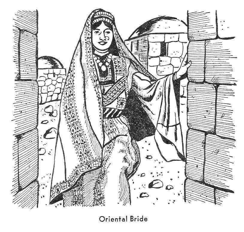 In going from the bride's house to the groom's house, the bride allowed her hair to be loose and flowing, and she had her face veiled. Some of her own relations preceded her in the procession, and scattered ears of parched grain to the children along the way. There were demonstrations of joy all along the road to the destination. Part of the procession included men who played on drums or other musical instruments. And there was dancing along the way.22 One of the punishments Jeremiah predicted for the Jews, because of their sins, was the taking away of wedding joys. "Then will I cause to cease from the cities of Judah, and from the streets of Jerusalem, the voice of mirth, and the voice of gladness, the voice of the bridegroom, and the voice of the bride" ( Jer 7:34).ARRIVAL AT THE HOUSE OF THE BRIDEGROOMThe most important moment of the entire marriage festivity was that in which the bride entered her new home.23 And as both groom and bride usually wore crowns, the Psalmist must have pictured this important moment in the marriage of the king: Psa 45:14-15). After arriving at the bridegroom's house, some of the older women had the task of arranging the bride's hair. Her flowing locks were hidden beneath a thick veil. From this time on, the custom would dictate that her face was not to be unveiled in public. She was led to her place under a canopy, which was located either inside the house, or if the weather permitted, in the open air. Her place was beside her husband, where both would hear new words of benediction given by one of the fathers, or by some important person who might be present.24. In the wedding at Cana of Galilee, JESUS was the most prominent guest present, and doubtless He was asked to pronounce His benediction upon the newlyweds ( Joh 2:1-11).THE WEDDING FEAST