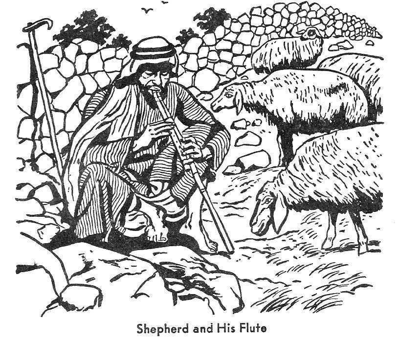 The shepherd, in addition to using his sling against wild animals or robbers, found it very handy in directing the sheep. A stone could be dropped close to a sheep that was lagging behind and startle it into coming along with the rest of the flock. Or if one would get away in another direction, then a stone would be slung so as to drop just beyond the straying sheep, and thus bring him back. It was the shepherd's sling that young David used in slaying the giant Goliath ( 1Sa 17:40-49).In her plea to David, Abigail was no doubt contrasting two items of his shepherd's equipment when she said, "The soul of my lord shall be bound in the bundle of life with the Lord thy God; and the souls of thine enemies, them shall he sling out, as out of the middle of a sling" ( 1Sa 25:29). The "bundle of life" is understood as either "the pouch of life," or "the bag of life," and most probably refers to the shepherd's scrip. David's enemies were to be like the stones in his sling, being that which was to be thrown away; whereas David's soul would be like the provisions in his scrip, which were to be kept and guarded by the LORD himself.10The shepherd's flute. A dual-piped flute of reed is generally carried by the Arab shepherd. It is true that minor strains of music come from this flute, but the heart of the shepherd is stirred, and the sheep of the flock are refreshed by the invigorating music that comes from this simple instrument. There can be little question but that David used such an instrument when he was with his flock, in the same way the shepherd lads have done for centuries around Bethlehem. It is of interest to know that the word in the Arabic language which is the equivalent of the Hebrew word for "psalm" is mazmoor, which means "played on a pipe or flute."11 FOOD AND WATER FOR THE FLOCKFood planned for the flock. One of the principal duties at all seasons of the year is for the shepherd to plan food for his flock. In the springtime there is an abundance of green pasture, and usually the sheep are allowed to graze near to the village where the shepherd's home is located. After the grain is reaped, and the poor have had an opportunity to glean what is left for them, then the shepherd brings in his flock, and the sheep feed on certain fresh growths, or dried blades, or an occasional ear of grain that the reapers may have left, or was overlooked by the gleaners. When this source of food is exhausted then the pasture is sought in other places. The wilderness of Judea which is located along the western side of the Jordan Valley is carpeted in the spring with a certain amount of grass and this turns into standing hay as the hot weather comes, and this becomes food for the sheep during part of the summer.12 Scripture often refers to shepherds looking for pasture for their flocks. "And they went to the entrance of Gedor, even unto the east side of the valley, to seek pasture for their flocks" ( 1Ch 4:39). The Psalmist thanks GOD for the pasturage which the LORD as Shepherd provides for His people: "So we thy people and sheep of thy pasture will give thee thanks for ever" (Psa 79:13).In the late autumn or winter months, there are times when the shepherd can find no pasturage that is available for his flock, and then he must become responsible for feeding the animals himself. If the flock is small there may be times when it is stabled within the peasant house, and the family lives on a sort of mezzanine floor above it. At such seasons of the year the shepherd must provide the food. This is what Isaiah meant when he said: "He shall feed his flock like a shepherd" ( Isa 40:11). In some sections of Syria, flocks are taken at this season to places in the mountain country, where the shepherd busies himself with the bushy trees, cutting down branches that have green leaves or tender twigs, that the sheep and goats can eat.13Micah was probably speaking of this custom of providing food for the sheep, when he said: "Feed thy people with thy rod, the flock of thine heritage" ( Mic 7:14).