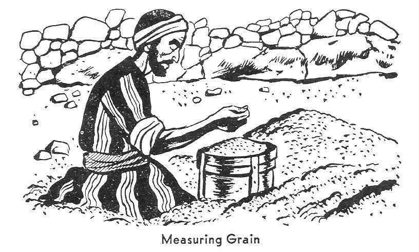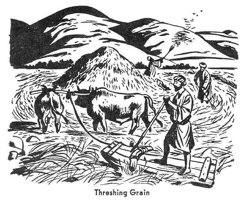 Growing and Harvesting GrainTHE NUMEROUS REFERENCES to the growth of grain, which are found in the law of Moses, indicate that it was expected that the Israelites would become an agricultural people after entering the land of Canaan, and that the cultivation of grain would become one of their chief industries. It is a remarkable fact that the methods used by them in growing and harvesting this crop are virtually the same as those that have been used by the Palestinian Arab peasants for centuries down to the present day. PRELIMINARY PREPARATION FOR PLANTING THE GRAIN Waiting for rain before beginning to plough. In Palestine, ploughing is done after the early rains have softened the earth (cf. Psa 65:10). These rains usually come the latter part of October or the first part of November. If they do not come then, the farmer must wait for them before he can plough his ground. Job said, "They waited for me as for the rain" (Job 29:23). Jeremiah described lack of rain thus: "There was no rain in the earth, the ploughmen were ashamed, they covered their heads" (Jer 14:4). Once the rain has come, the industrious farmer will start his ploughing. "The sluggard will not plough by reason of the cold" (Pro 20:4). Such a man will retreat into his home and enjoy the warmth of his fire, but he will miss the harvest. Dr. Thomson tells of one year when the farmers waited until the month of February for sufficient rain to enable them to plough the ground for the grain crop. The harvest came late, but was abundant.1Getting ready for ploughing. The farmer gets ready for ploughing after the first rain starts falling, if he has not already done so before. He will spend the time making sure that his plough is in good repair and ready for action. He may need to cut and point a new goad to use in prodding his team of oxen. He must also see to it that his yoke is smooth and fits the necks of the animals. An ill-shaped or heavy yoke would gall them. The LORD JESUS spoke of "the easy yoke" promised to His obedient followers ( Mat 11:30). When the ground has been softened sufficiently by the rain, then the ploughing can begin.2EQUIPMENT USED IN PLOUGHINGThe Plough. One type of Syrian or Palestinian plough is made up of two wooden beams which are joined together, and at the front end it is hooked to a yoke, and at the rear end it is fastened to a crosspiece, the upper part of which serves as the handle, and the lower part holds the iron ploughshare or colter.3 Even today many may be seen in Bible lands plowing with what we might term a "forked stick." Bible writers often mention iron ploughshares ( 1Sa 13:20, etc.). These ploughs could without much work be changed into swords for warfare. Thus the prophet Joel said: "Beat your ploughshares into swords" (Joe 3:10). Exactly the reverse of this prophecy was suggested by both the prophets Isaiah and Micah in predicting the Golden Age (Isa 2:4; Mic 4:3).The yoke. The yoke is a rude stick that fits the necks of the cattle. Two straight sticks project down each side, and a cord at the end of these sticks and underneath the cattle's necks holds the yoke on the necks.4